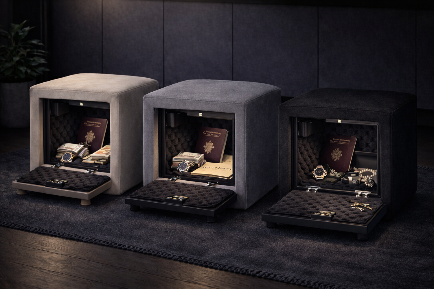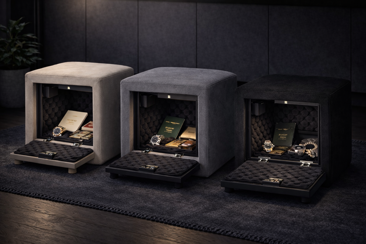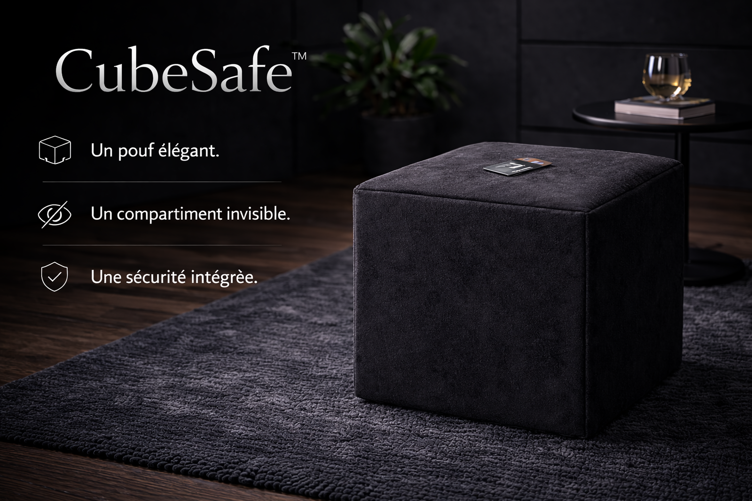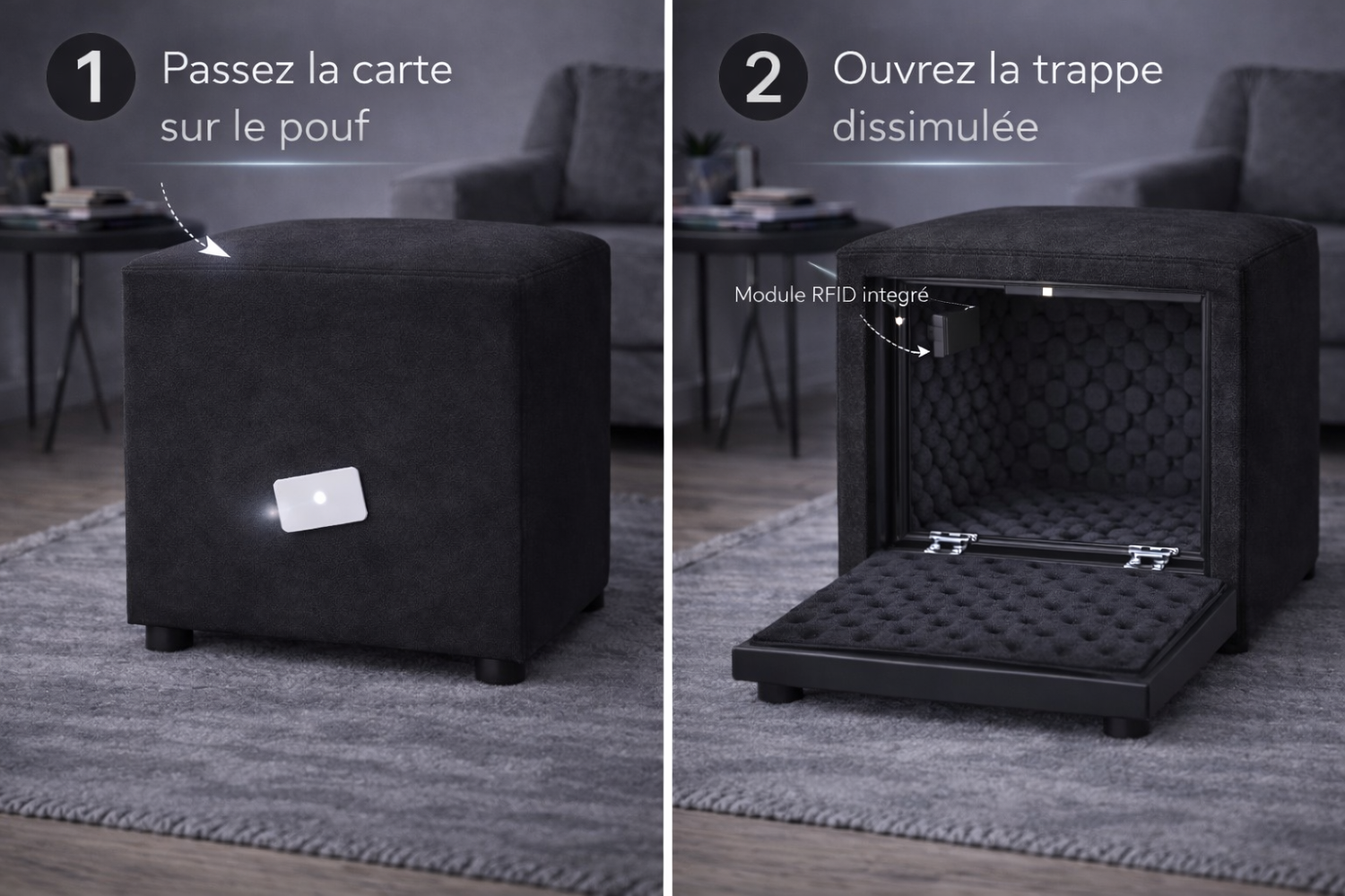 Le compartiment est totalement dissimulé dans le pouf et reste invisible sans la carte RFID.
